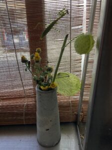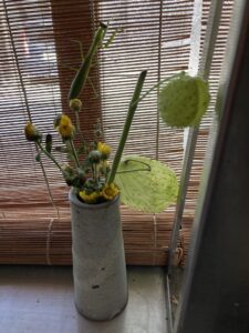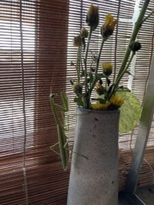 台所に行くと目の前にカマキリが、どこから入ってきたのか、今朝頂いた草花の中に紛れ込んでいたのかもしれません。外に出る気配はありません?
