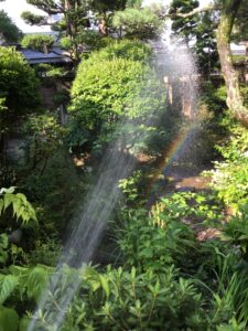 今日は処暑、太陽が次第に衰え暑熱も衰えるという意味だそうですが、日中は相変わらずの酷暑。それでも日が沈むのは少しずつ早くなり、虫の音とともに秋の到来を告げています。朝も日差しが少し和らいだので水まきをしました。夕方とは違う虹が生まれる幸せ水まき…。