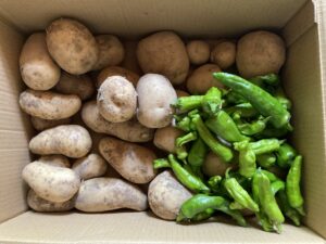お昼に知人から五色の彩やかなグラジオラスを頂きました。それと一緒にジャガイモ、ピーマン、シシトウまで。ビタミンカラーとビタミンBパワー、78歳の知人の元気パワーで猛暑を乗り切ります!