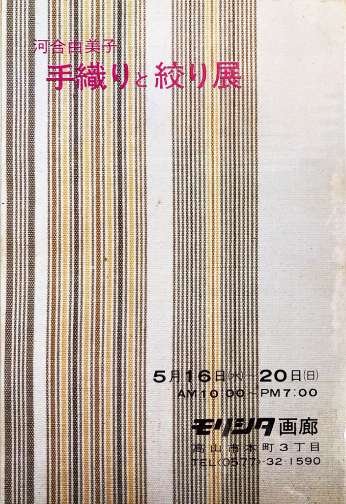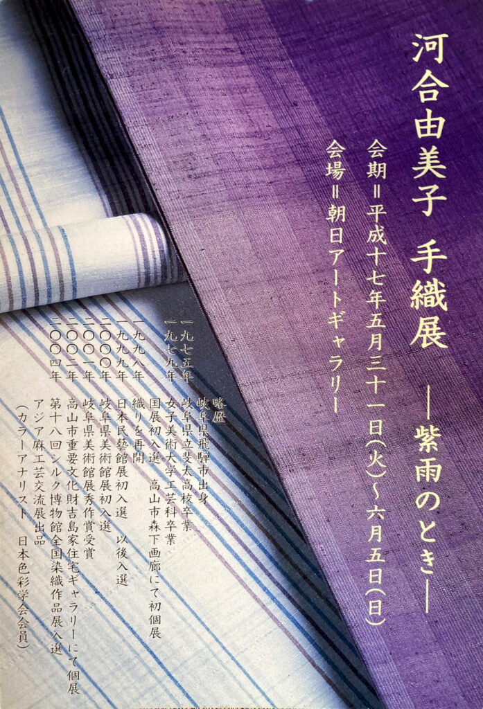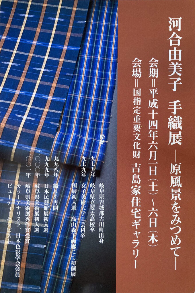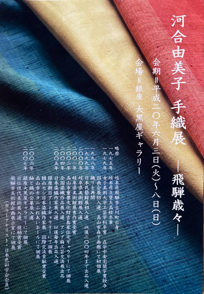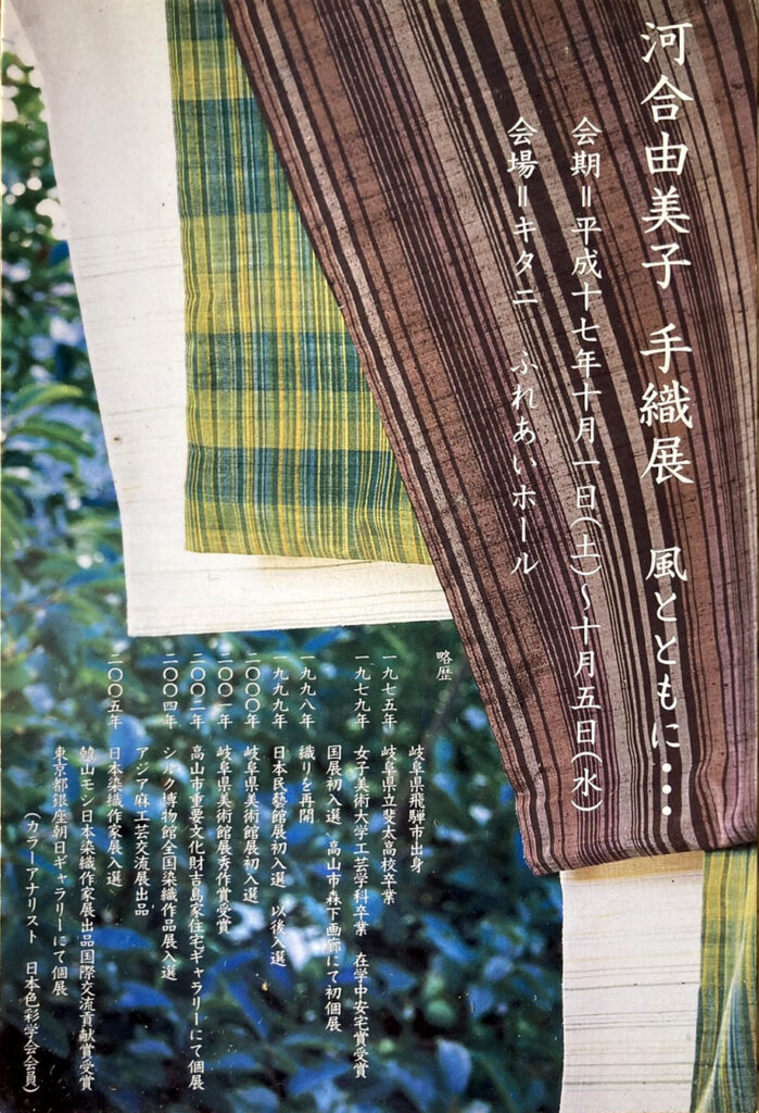 夢の実現 念ずれば花開く放てば手にみてり 織りに還り、故郷に工房を開くまでの歩み。 ※画像に触れていただくと、個展への想い、主旨につながります。 河合由美子手織展 -飛騨歳々-2008年 河合由美子手織展織り内なる祈り・・・2007年12月 河合由美子手織展光ありて色ありて2007年5月 河合由美子手織展風とともに・・・2005年10月 河合由美子手織展-紫雨のとき―2005年5月 河合由美子手織展-原風景をみつめて―2002年 染織を再開 河合由美子手織りと絞り展1979年